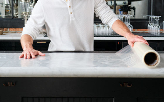 ฟิล์มป้องกันเคาน์เตอร์หินอ่อนเป็นแผลปกติหรือแผลย้อนกลับฟิล์มโพลีเอทิลีนเคลือบด้วยกาวอะคริลิกไวต่อแรงกดเป็นฟิล์มที่เหนียว ทนทาน ซึ่งเหมาะสำหรับปกป้องพื้นแข็ง พื้นไม้ เคาน์เตอร์ กระเบื้องเซรามิก หินอ่อน และอื่นๆวิ่งด้านหนึบเข้าออกได้ตามต้องการสะดวกและประหยัดในการใช้งาน อีกทั้งยังสามารถลอกออกได้โดยไม่มีสารตกค้าง